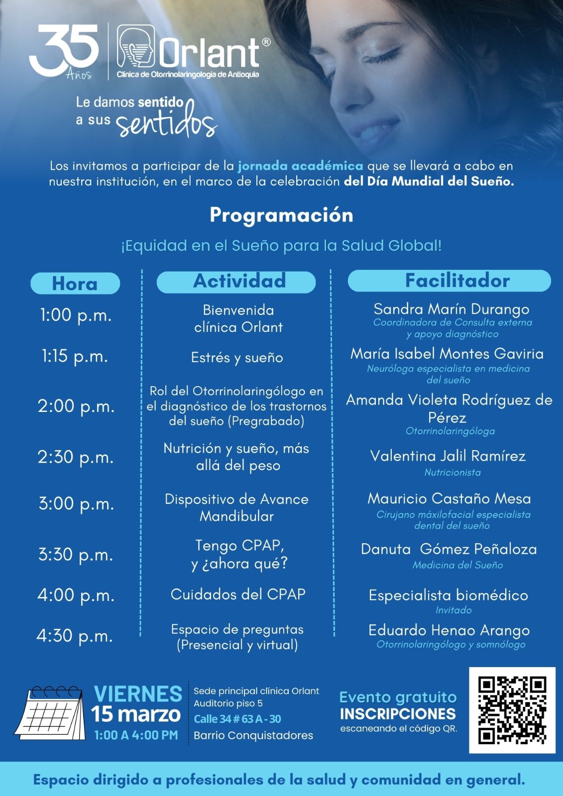Short Bio: Clínica de Otorrinolaringología de Antioquia con más de 35 años de experiencia en los diferentes servicios , y con más de 15 años de la Unidad Sueño y Ronquido con Laboratorio de Sueño, consulta médico especialista por otorrinolaringología, somnología ,cirugía maxilofacial, Nutrición,Terapias Orofacial y Respiratoria.