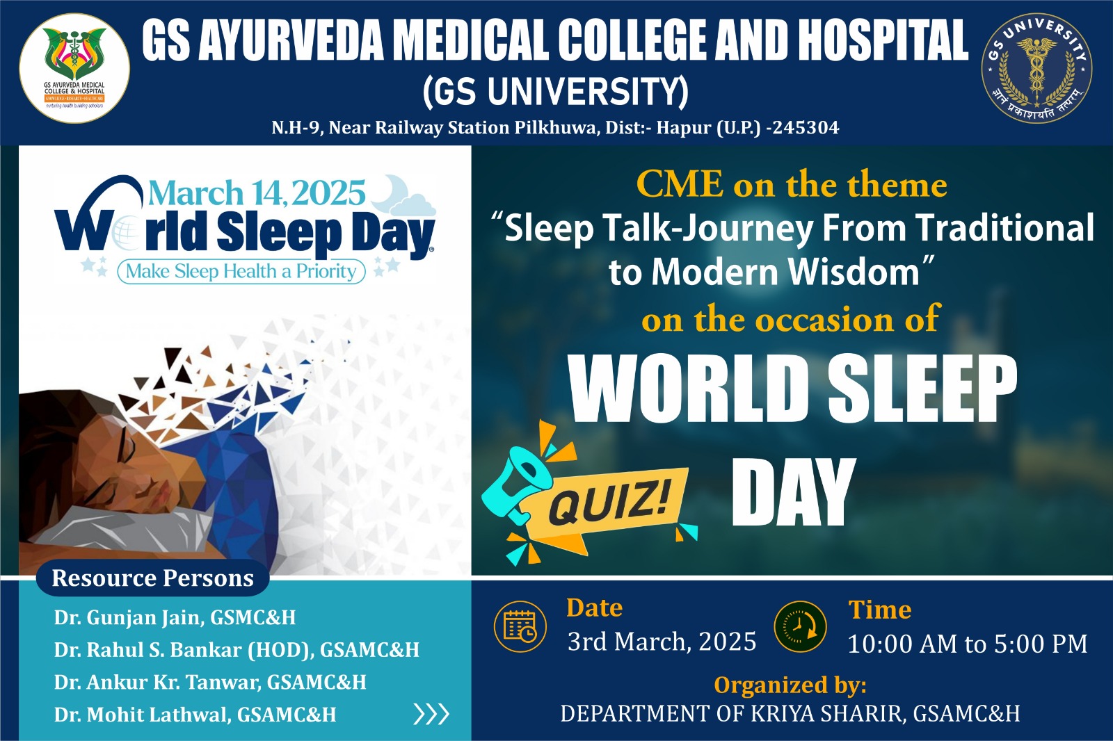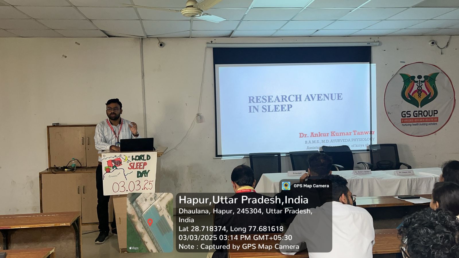 Activity: 1. I organized a CME on “Sleep Talk: Journey from Traditional to Modern Wisdom” at GS Ayurveda Medical College and Hospital, on 03 March 2025 along with a sleep quiz for students. The pledge to make sleep health a priority was also taken up by the faculties and students in the end. I also took a lecture on the topic ” Research Avenue in sleep” which was appreciated by the students and the faculties.